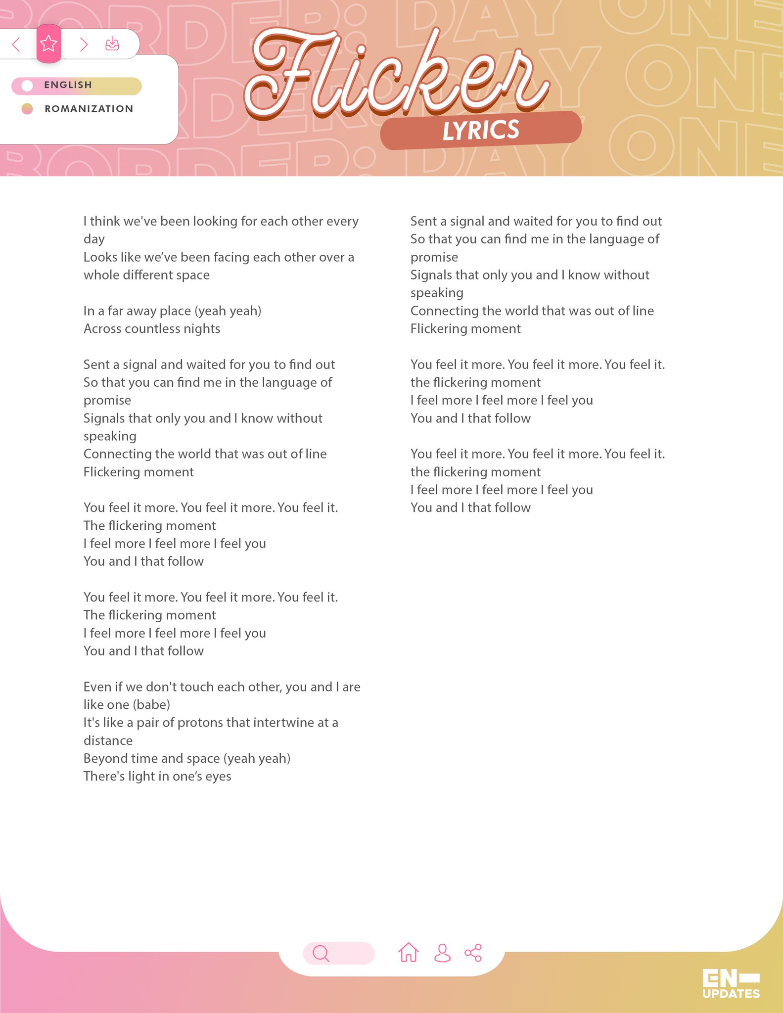 I think weve been looking for each other every day Looks like theyve been facing each other over a whole different space Far. Translation of Flicker by ENHYPEN 엔하이픈 from Korean to English Deutsch English Español Français Hungarian Italiano Nederlands Polski Português Brasil Română Svenska Türkçe Ελληνικά Български Русский Српски العربية فارسی 日本語 한국어. Video clip and lyrics Flicker by Enhypen.